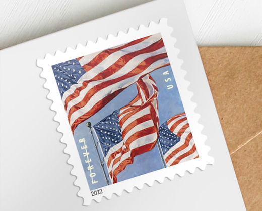 Patriotic U.S. Flag stamps originally issued by the post office on January 9, 2022. The stamp art is a painting of three flags in a circular formation, reminiscent of the 50 flags encircling the Washington Monument. The artist used three separate photographs of the same flag taken seconds apart as reference and stitched together the images into a single composition.