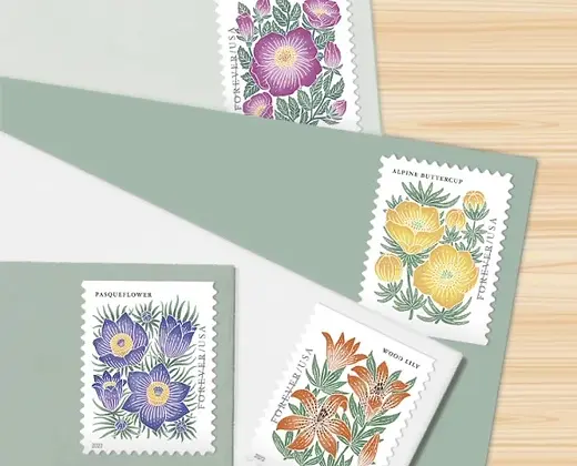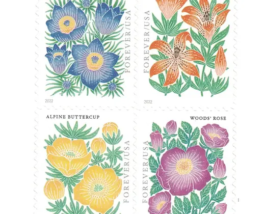 These cheerful USPS stamps celebrate the beauty of mountain flowers. Each Mountain Flora stamp features a different flower: a purple pasqueflower, an orange-red wood lily, a bright yellow alpine buttercup and a dark pink Woods’ rose. The artist’s hand-drawn illustrations, refined digitally, create a block-print aesthetic. Art director Ethel Kessler designed the stamps with original art by Lili Arnold.