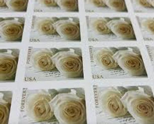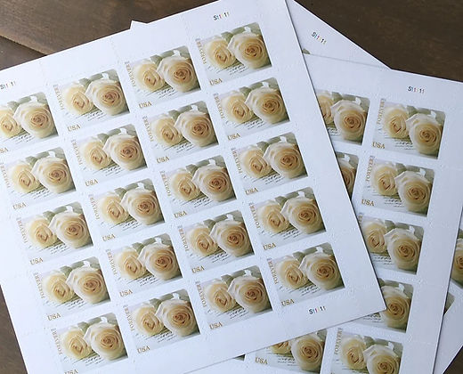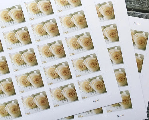 100 White Rose Postage Stamps. The wedding roses commemorative stamp features two beautiful white roses to ensure that your wedding correspondence will be remembered. They mention it's a nice touch for bridal shower invites, perfect for wedding invitations, greeting cards, love letters, and more.