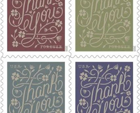 100 Thank You Postage Stamps. These elegant and joyful stamps will add visual appeal to notes, cards, and letters of thanks sent to acknowledge a favor, an act of kindness, or a job well done or to express thanks for gifts sent for any occasion including birthdays, graduations, holidays, and weddings.